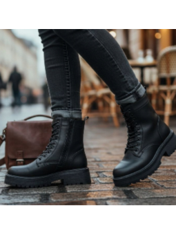 Stylowa cholewka wykonana z ekologicznej skóry prezentuje się elegancko i nowocześnie, a praktyczne zapięcie na suwak oraz sznurowanie pozwala idealnie dopasować obuwie do stopy. Klasyczny okrągły nosek sprawia, że buty są komfortowe nawet przy dłuższym noszeniu. Wnętrze botek zostało ocieplone kocem obuwniczym, co zapewnia przyjemne ciepło i ochronę przed chłodem. Podeszwa wykonana z tworzywa sztucznego w kolorze czarnym. Traperek na podeszwie jest antypoślizgowy i ułatwia chodzenie w trudniejszych zimowych warunkach. Dodatkowe zdobienia na cholewce w postaci prerforacji dodają całości charakterystycznego uroku.