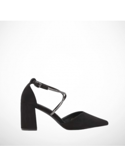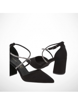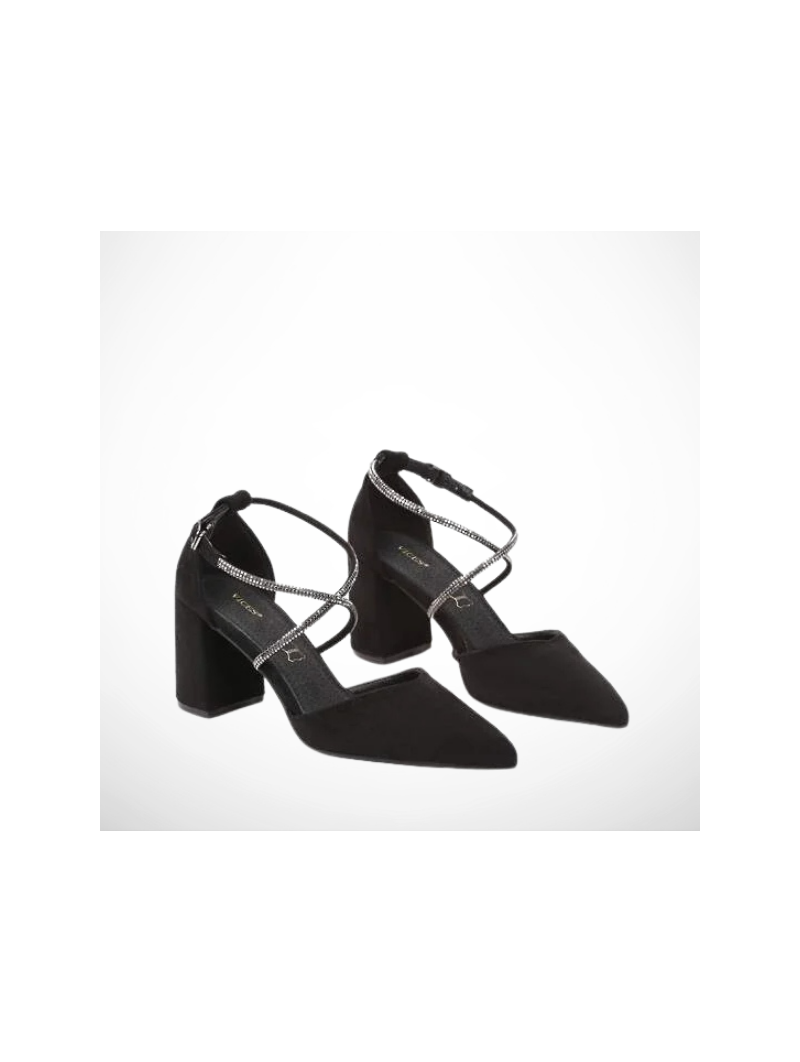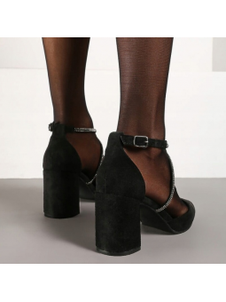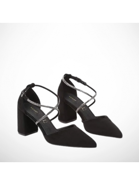 Te stylowe czółenka mają cholewkę wykonaną z wysokiej jakości materiału w czarnym kolorze, który nadaje im luksusowy wygląd i trwałość. Wkładka wewnętrzna, wykończona skórą naturalną, zapewnia komfort użytkowania, a dzięki swojej miękkości umożliwia noszenie butów przez długi czas bez uczucia zmęczenia. Nosek w szpic dodaje subtelności i podkreśla kobiecy charakter obuwia, czyniąc je idealnym wyborem na wyjątkowe okazje. Charakterystyczny, stabilny obcas dodaje pewności kroku. Subtelne cyrkonie wzdłuż pasków będą mienić się przy każdym kroku, dodając całości wyrafinowanego blasku.