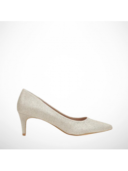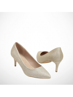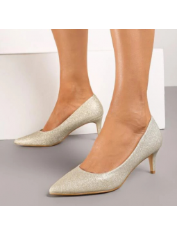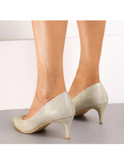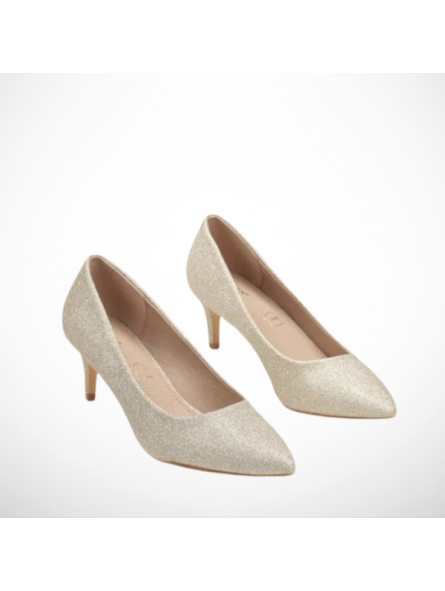Cholewka, w całości pokryta lśniącą, brokatową tkaniną w złotym  kolorze, sprawia, że stają się one głównym punktem każdej stylizacji. Komfortu podczas długiego użytkowania podnosi wkładka ze skóry naturalnej. Obuwie wyróżnia się klasycznym fasonem: smukły nosek w szpic elegancko wysmukla sylwetkę. Obcas typu szpilka, również pokryty brokatem, dopełnia model, nadając mu kobiecego i zdecydowanego charakteru.