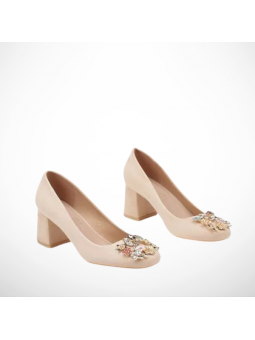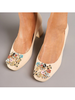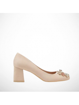 Model wykonany z przyjemnej w dotyku skóry ekologicznej - zamszowej, który pięknie podkreśla kolor i formę buta. Wkładka wykonana z naturalnej skóry, a stabilny, szeroki obcas typu klocek zapewnia komfort noszenia przez cały dzień. Ozdobna aplikacja z subtelnych kryształków na nosku dodaje całości wyjątkowego, biżuteryjnego charakteru.