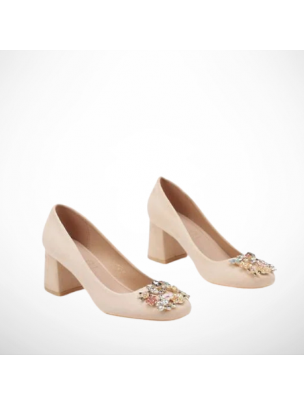 Eleganckie beżowe czółenka damskie ze skóry ekologicznej zamszowej i skórzaną wkładką na obcasie 2349B