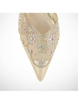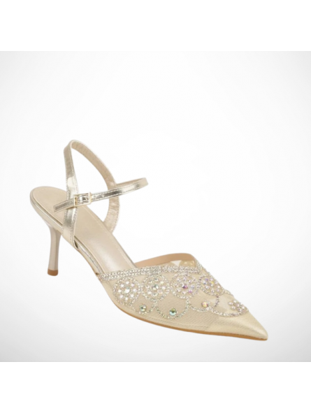 Złote, eleganckie czółenka na szpilce siateczkowe ozdobione cyrkoniami 2376B