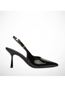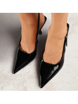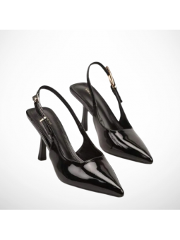 Model w klasycznym, czarnym odcieniu zachwyca minimalistycznym designem i delikatnymi detalami w postaci lakierowanej cholewki. Smukły obcas pięknie wysmukla sylwetkę, a stabilna konstrukcja zapewnia komfort noszenia przez cały dzień. Regulowany pasek z ozdobną klamrą pozwala  idealnie dopasować but do stopy.