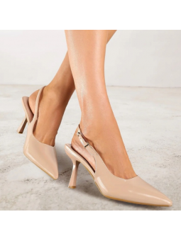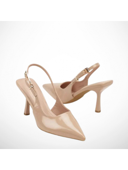 Model w subtelnym, ciemnobeżowym odcieniu zachwyca minimalistycznym designem i delikatnymi detalami w postaci lakierowanej cholewki. Smukły obcas pięknie wysmukla sylwetkę, a stabilna konstrukcja zapewnia komfort noszenia przez cały dzień. Regulowany pasek z ozdobną klamrą pozwala  idealnie dopasować but do stopy.