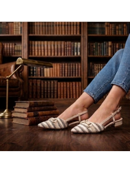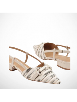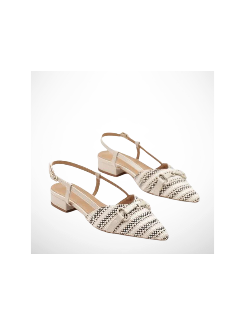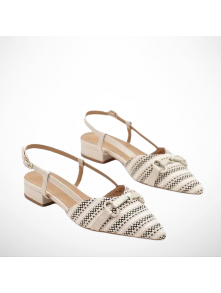 Nosek w delikatny szpic optycznie wysmukla stopę , a elegancka, metalowa klamra na przodzie dodaje obuwiu biżuteryjnego blasku. To model typu : slingback ( bez pięty ), z subtelnym paskiem wokół kostki zapinanym na sprzączkę, co zapewnia idealne dopasowanie i stabilność.