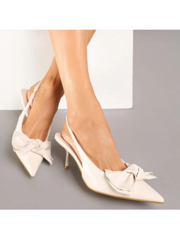 Klasyczne, beżowe czółenka lakierowane na szpilce z eko skóry z wolną piętą i ozdobna kokardką 2742B