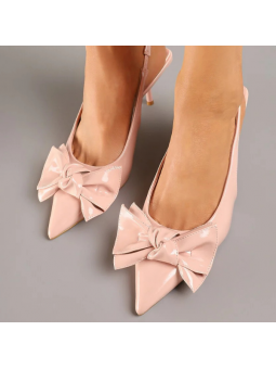 Klasyczne, różowe czółenka lakierowane na szpilce z eko skóry z wolną piętą i ozdobna kokardką 2742B