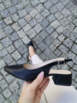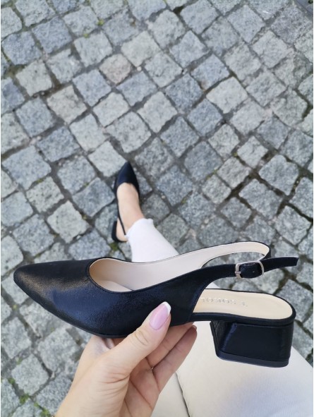 Czarne czółenka damskie satynowe z wolną piętą na niskim obcasie typu klocek FD01