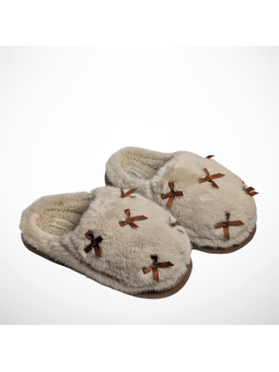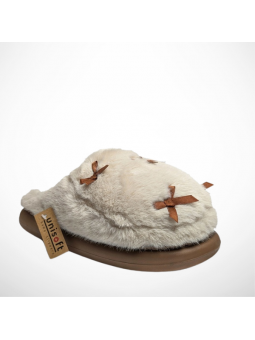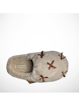Urocze beżowe kapcie damskie domowe futrzane z ozdobnymi kokardkami UNISOFT 98-9256