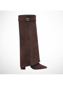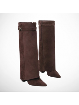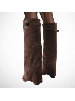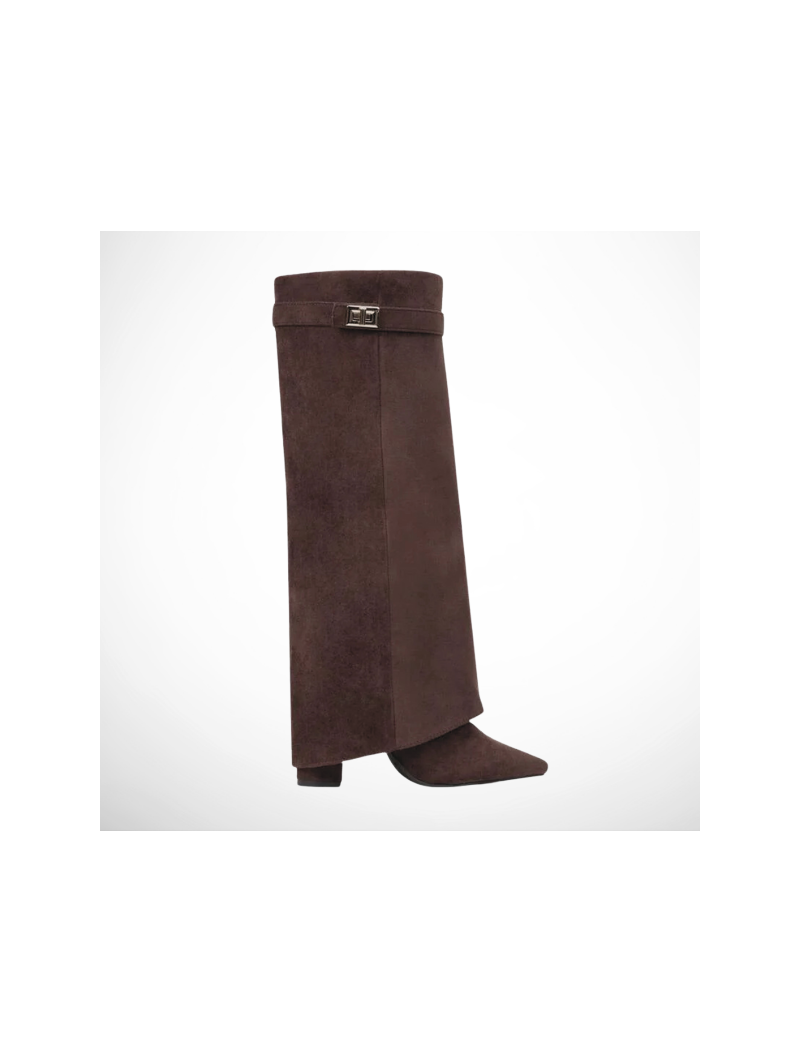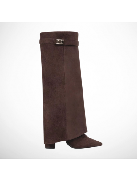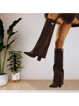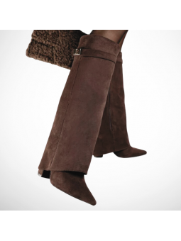 Eleganckie kozaki damskie zamszowe z wywiniętą cholewką i odpinanym paskiem na obcasie typu słupek LA3150