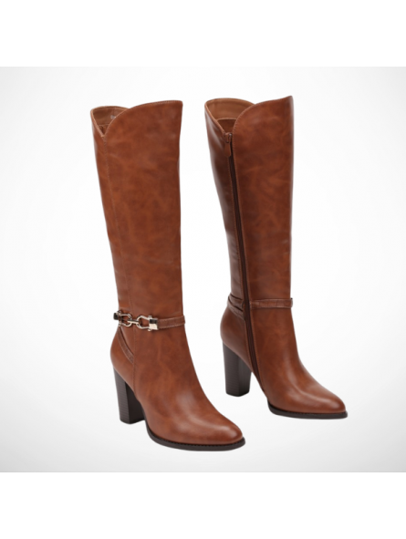 Kozaki zostały wykonane z wysokiej jakości miękkiej skóry ekologicznej, co nadaje im szlachetnego wyglądu, a jednocześnie sprawia , że obuwie jest trwałe i łatwe w pielęgnacji. Wnętrze obuwia zostało ocieplone miękkim kocem, który zapewnia stopom przyjemne ciepło. Słupkowy obcas, na którym osadzone zostały kozaki jest bardzo dobrze wyprofilowany i stabilny. Zamek błyskawiczny z boku ułatwia zakładanie, a elegancka ozdoba w postaci paseczka z metalową klamrą dodaje całości stylowego akcentu.