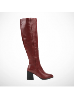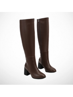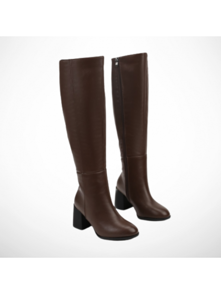 Kozaki damskie zostały wykonane z wysokiej jakości miękkiej skóry ekologicznej, co nadaje im szlachetnego wyglądu, a jednocześnie sprawia , że obuwie jest trwałe i łatwe w pielęgnacji. Wnętrze obuwia zostało ocieplone miękkim kocem, który zapewnia stopom przyjemne ciepło. Szeroki obcas typu klocek, na którym osadzone zostały kozaki jest bardzo dobrze wyprofilowany i stabilny, dzięki czemu stopy się nie męczą po długich godzinach użytkowania. Długość cholewki sięgającej do kolan ma nie tylko praktyczne zastosowanie, zapewniając ochronę i komfort podczas dłuższych spacerów, ale także wpływa na wydłużenie i wysmuklenie sylwetki. Kozaki zostały wyposażone w zamek, co ułatwia szybkie zakładanie.