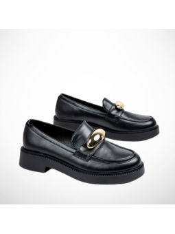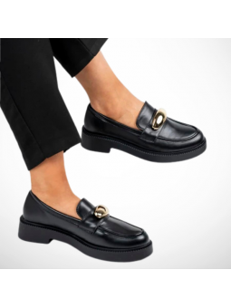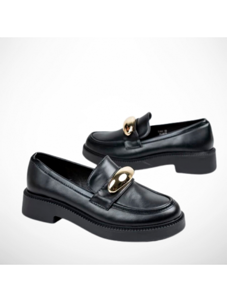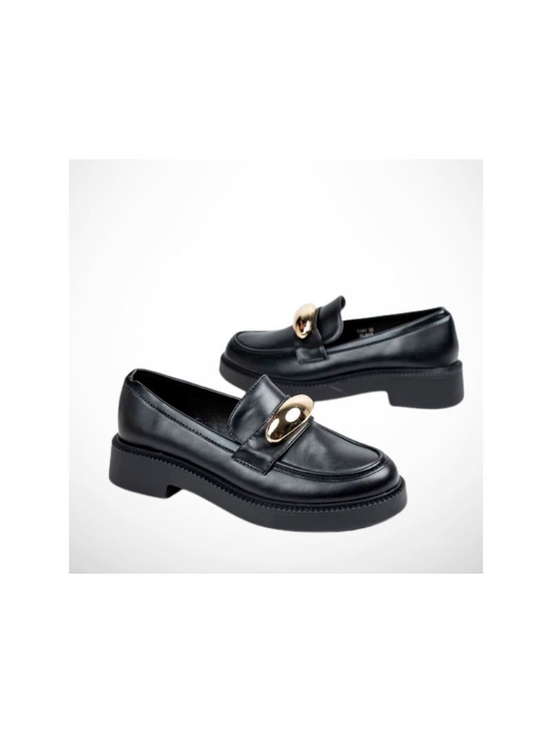 Mokasyny są wykonane z wysokiej jakości skóry ekologicznej w subtelnym, czarnym odcieniu, który dodaje im uniwersalnego charakteru. Charakteryzują się ozdobnym złotym detalem, który dodaje im szyku.
