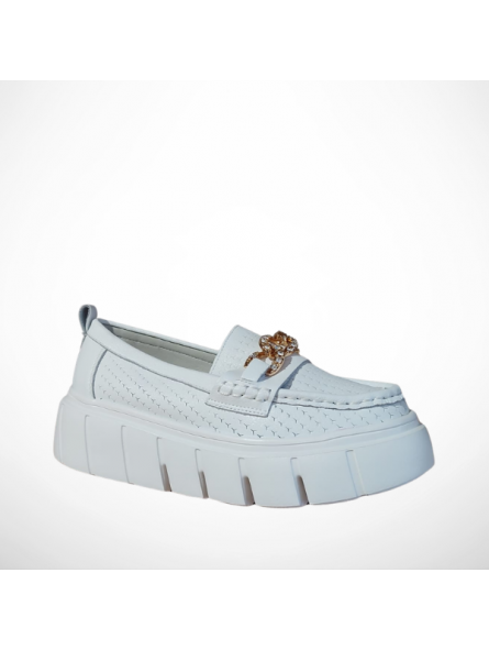 Mokasyny wykonane ze skóry naturalnej, oferują wyjątkową trwałość i luksusowy wygląd. Biały odcień z subtelnymi zdobieniami w postaci błyszczącego łańcucha dodaje im wyrafinowania, czyniąc je idealnym wyborem na różnorodne okazje. Skórzana wkładka dostarcza doskonałego wsparcia dla stopy, zwiększając wygodę noszenia przez cały dzień. To idealne rozwiązanie dla osób ceniących sobie zarówno styl, jak i komfort. Solidna, biała podeszwa nadaje im nowoczesnego charakteru i zapewnia doskonałą przyczepność, co sprawia, że mokasyny te są idealne nie tylko na co dzień, ale także na bardziej formalne wyjścia. Model wsuwany sprawia, że buty są bardzo wygodne w zakładaniu i zdejmowaniu. Neutralny biały kolor butów łatwo dopasować do różnych ubrań,takich jak jeansy, sukienki czy spodnie materiałowe.