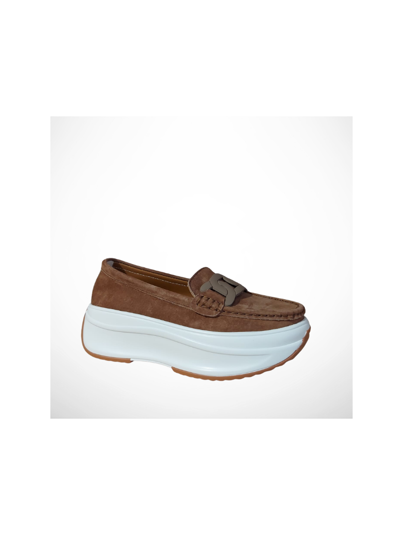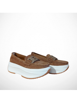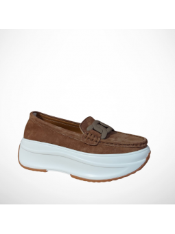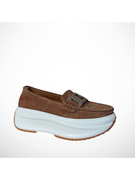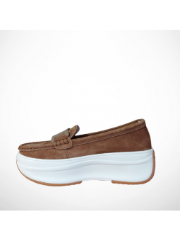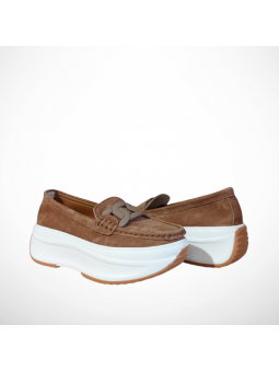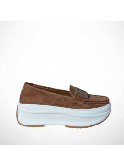 Przepiękne zamszowe mokasyny na wyższej platformie wykonane z najwyższej jakości skóry naturalnej zamszowej. Buty mimo masywnej podeszwy są bardzo lekkie a cholewka miękka, co zapewnia Ci komfort chodzenia w butach nawet przez cały dzień. Wyższa podeszwa wysmukla nogi oraz dodaje parę centymetrów. Uniwersalny kolor cholewki będzie pasowało do wielu Twoich stylizacji. Z dbałością o komfort i zdrowie stóp wewnątrz mokasynów została zastosowana wkładka wykonana z miękkiej skóry naturalnej. To idealne rozwiązanie na cieplejsze dni, ponieważ skóra naturalna zapobiega nadmiernemu poceniu się.