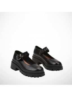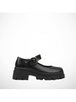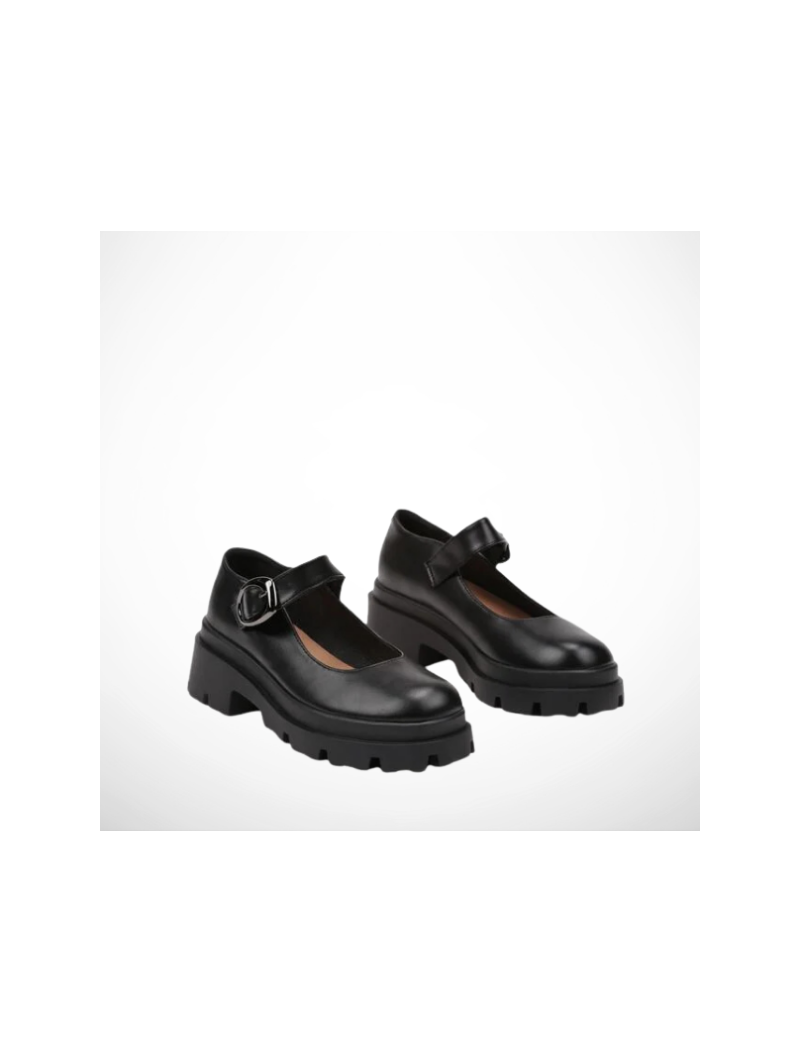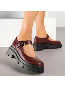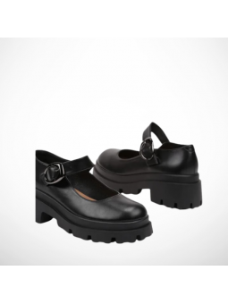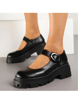 Półbuty wykonane z miękkiej skóry ekologicznej, wyposażone w regulowany pasek z ozdobną, metalową klamrą, która dodaje im wyrazistości. Gruba, kontrastowa podeszwa zapewnia stabilność i komfort noszenia przez cały dzień, a jednocześnie nadaje butom modowego, miejskiego looku.