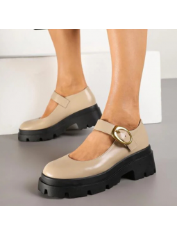 Stylowe półbuty damskie na platformie w beżowym kolorze, łączące klasyczną formę z nowoczesnym charakterem.