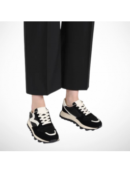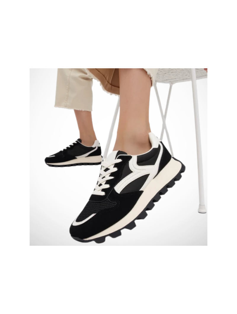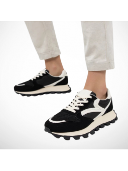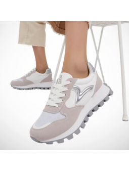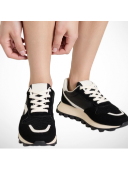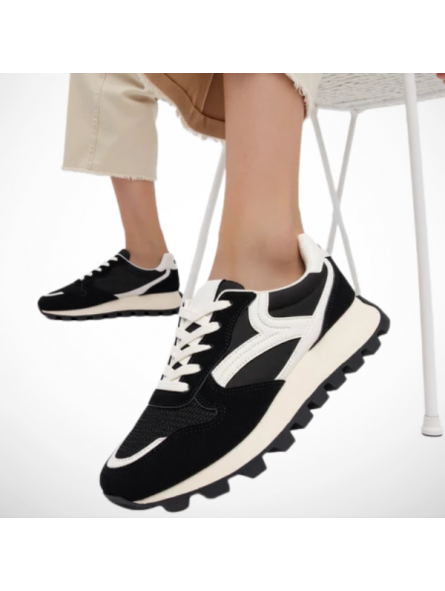 Cholewka z miękkiego zamszu ekologicznego, siateczki oraz wstawek z ekoskóry nie tylko zachwyca designem, ale także gwarantuje komfort i lekkość.  Gruba ząbkowana podeszwa w czarnym kolorze zapewnia odpowiednią przyczepność i modny, masywny look.