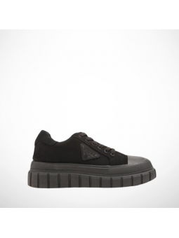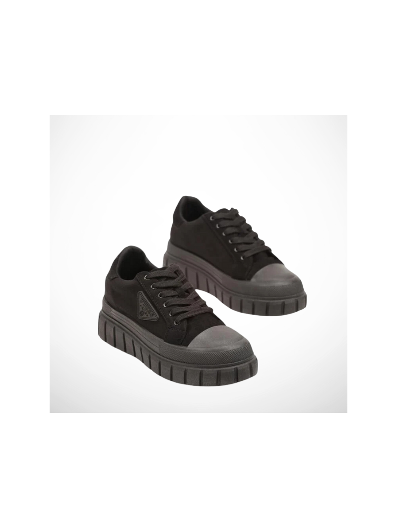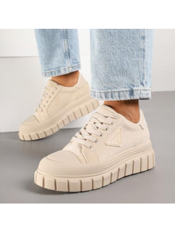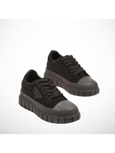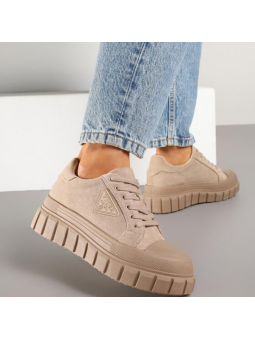 Sneakersy wykonane zostały z wysokiej jakości ekozamszu, natomiast wkładka wyłożona miękką tkaniną, co podnosi komfort użytkowania. Wyróżniają się płaską, solidną podeszwą o charakterystycznym wzorze z geometryczną aplikacją. Nosek buta zaokrąglony, a sznurowanie zapewnia łatwe dopasowanie do stopy.