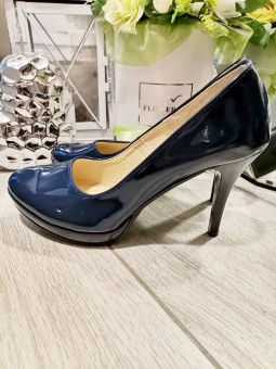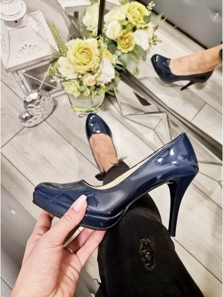 Granatowe szpilki damskie lakierowane na platformie z zaokrąglonym czubkiem i skórzaną wkładką