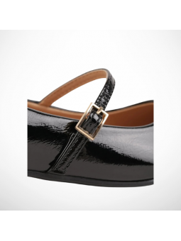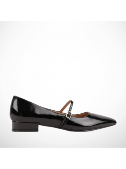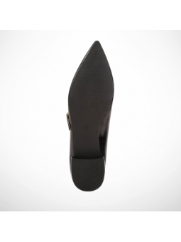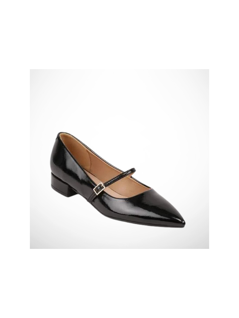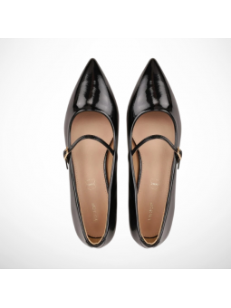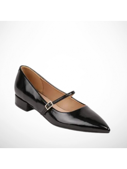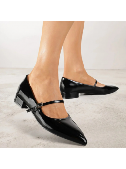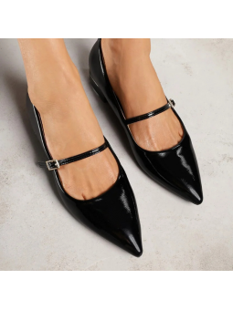 Czarne, klasyczne baleriny z noskiem w szpic i ozdobnym paskiem. Miękka, gładka skóra ekologiczna, lakierowana otula stopę, tworząc minimalistyczny, ale bardzo elegancki fason.Wkładka ze skóry naturalnej zapewnia miękkość i dodaje poczucia komfortu podczas długiego użytkowania obuwia. Regulowany pasek dodaje charakterystycznego wyglądu oraz pozwala dopasować obuwie do indywidualnych potrzeb.